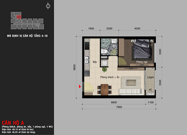 - 1 Pn+ 1 WC: 1 Căn/Tầng, diện tích 49.19 m2